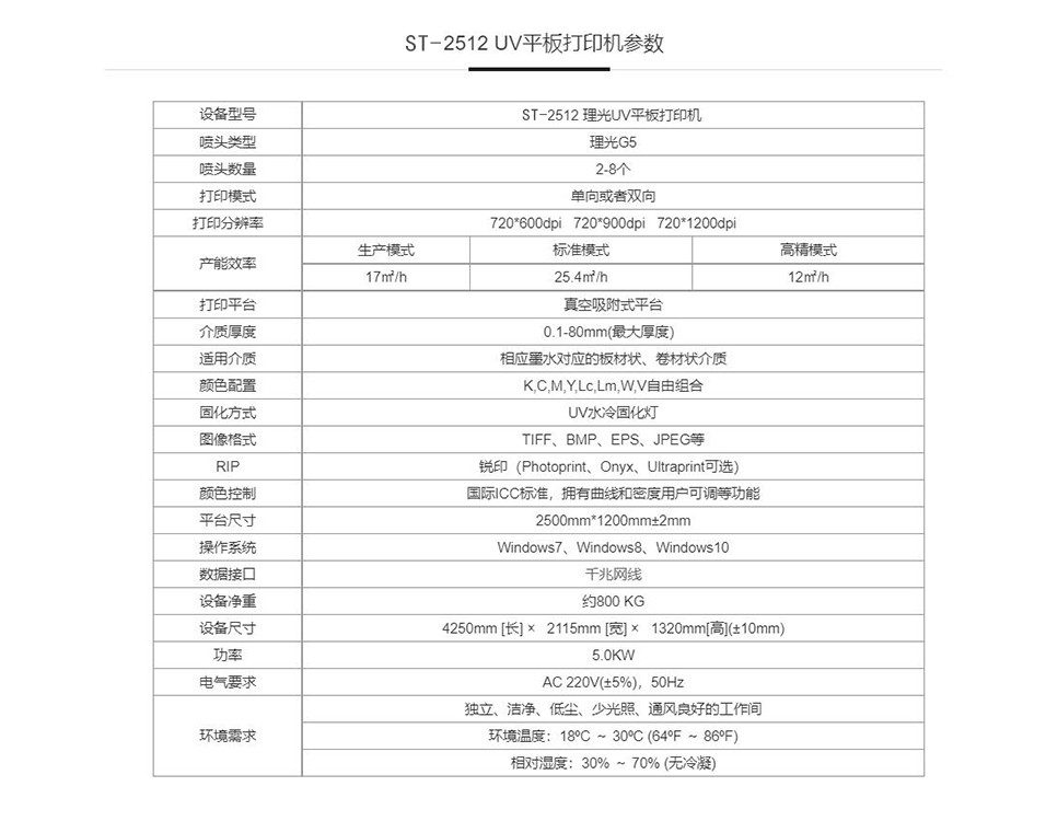 ST2512 UV平板打印機為世通中大型UV平板打印機,它廣泛運用在廣告UV打印行業、背景墻UV打印行業、藝術品uv打印行業、手機殼UV打印行業、包裝盒UV打印行業、玩具UV打印行業、家裝UV打印行業等所有行業及材料的平面UV打??;可打印尺寸2500MM*1200MM, 光彩白同步輸出的先進工藝,介質厚度在0.1-80MM。
